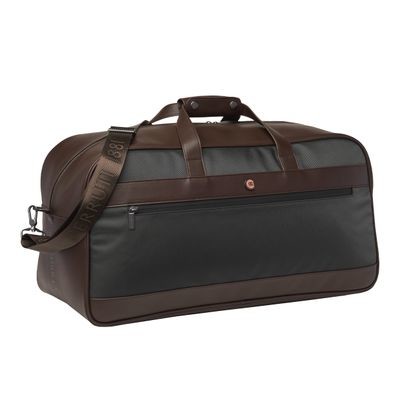 Minimal, elegant and understated the Bond travel collection is mixing contemporary nylon with luxurious vegan leather texture for a result that is easy to wear and match with any outfit. The bags are signed with a matt version of our CRR plate. All details are carefully though about : from zippers with engraved logo to an oversized yet subtle CERRUTI 1881 signature embossed on the side of the bag. This item is also very functional : roamy and easy to organise. It is available in 2 color versions : All black, or mixing brown and grey for a resolutely chic result.