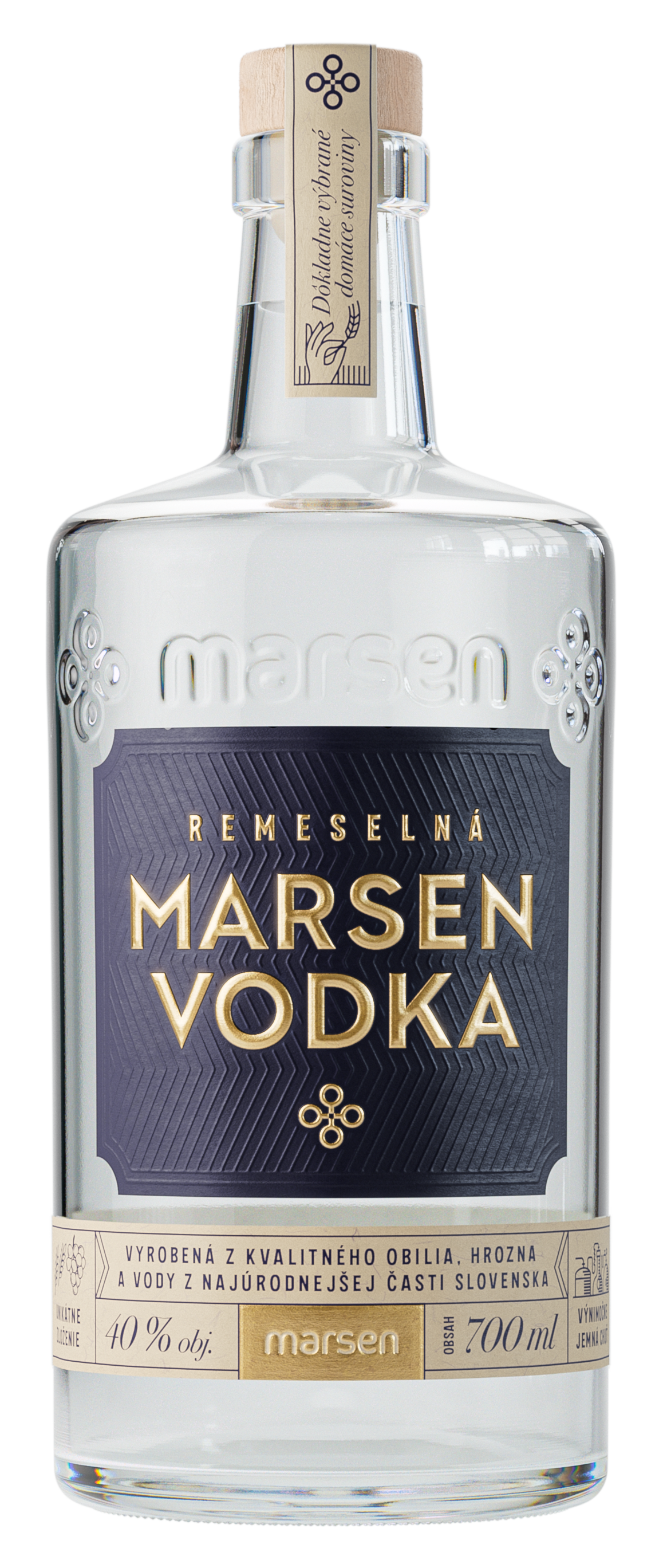 Craft Vodka Marsen 40% is a Slovak vodka produced in small batches with an emphasis on quality. Its exceptionally smooth taste is created by combining pure grain spirit and unique grape spirit in a precisely balanced ratio. Ideal for sipping neat, on ice or as a base for premium mixed drinks. The perfect choice for those looking for a traditional Slovak vodka with a modern character. Volume: 700 ml