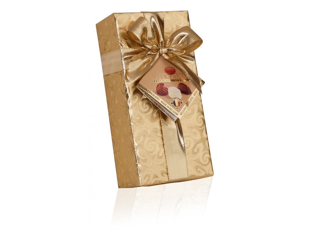 The luxurious box of chocolates contains 16 filled Belgian pralines made of milk, dark and white chocolate. The pralines are carefully packaged in an elegant gold box with a gold ribbon, making them an ideal gift for all lovers of quality chocolate. You will find 8 pieces of milk pralines, 4 pieces of dark chocolate and 4 pieces of white chocolate.