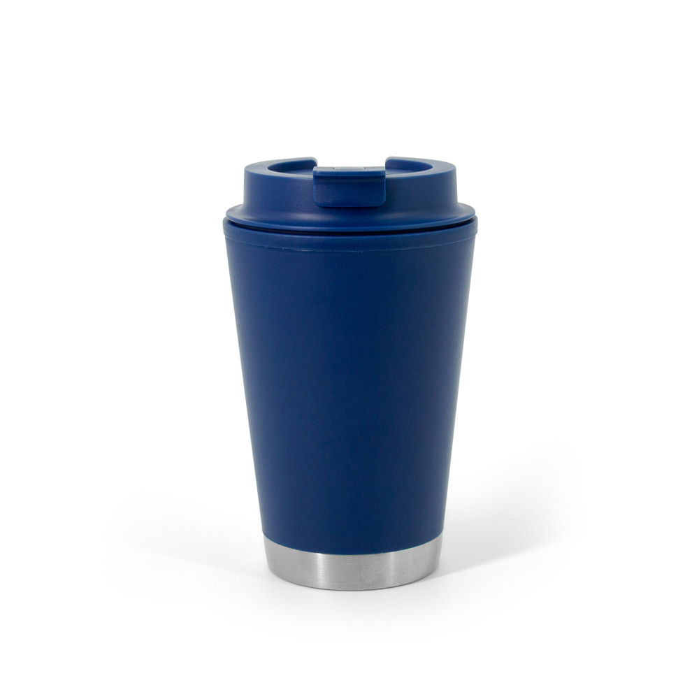 Double-walled vacuum insulated travel cup made of stainless steel and PP. Matte finish and powder coating to give it greater durability and resistance. Capacity up to 470 ml. Supplied in a box. ø90 mm x 150 mm