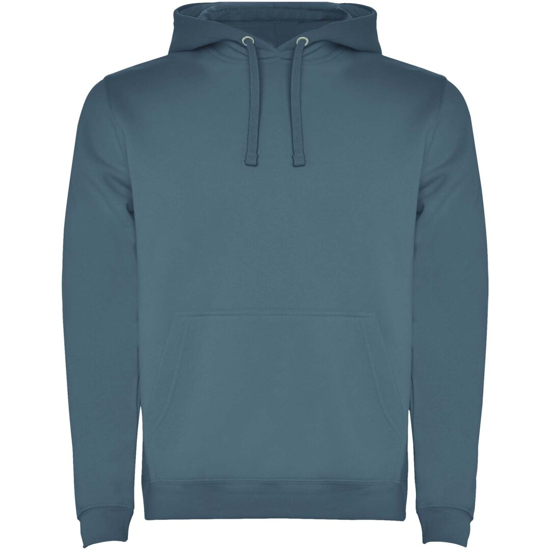 Hoodie with double fabric, adjustable drawcord, reinforced covered seams in collar and kangaroo style pocket. Available in uni-colours and two-tone colours. 1x1 elastane rib in cuffs and waistband. Removable label. The model is 185 cm and is wearing size M.