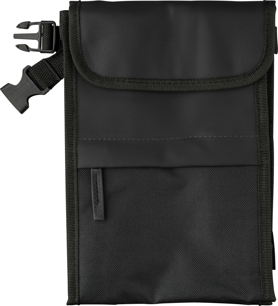 Lightweight beach mat in 210T polyester measuring 200x210cm. Includes 4 black hooks and a matching drawstring pouch for easy carrying.