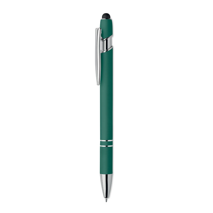 Push-type pen made of recycled aluminium with iron clip and colour rubberised barrel. Blue ink.